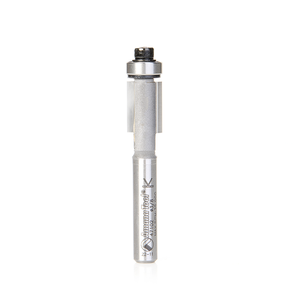 Use this flush trimming bit for laminate work or for template and pattern work. For template application, the bearing follows the template, while the cutting edges trim the workpiece. With the router handheld, the template is on the bottom of the work. With a table-mounted router, the template is on top. A two-flute bit is a good general-purpose choice, providing fast cuts and good finishes. Excellent for template work.